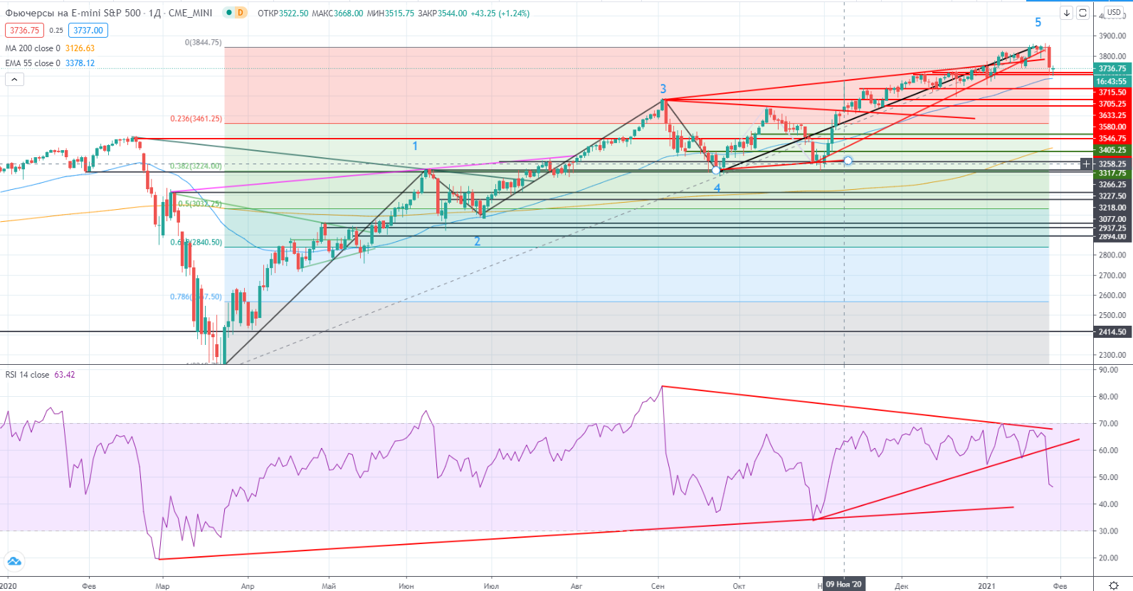 Вернусь к более полному графику-не было дивергенции в третьей волне. Значит возможен повтор хая. Значит сейчас идет только коррекция к росту, начатого 18 марта прошлого года. Если это брать за основу, то мы по идее должны увидеть трехволновую коррекцию ABC. Эти волны также можно разложить на подволны, и вот с этим была проблема.