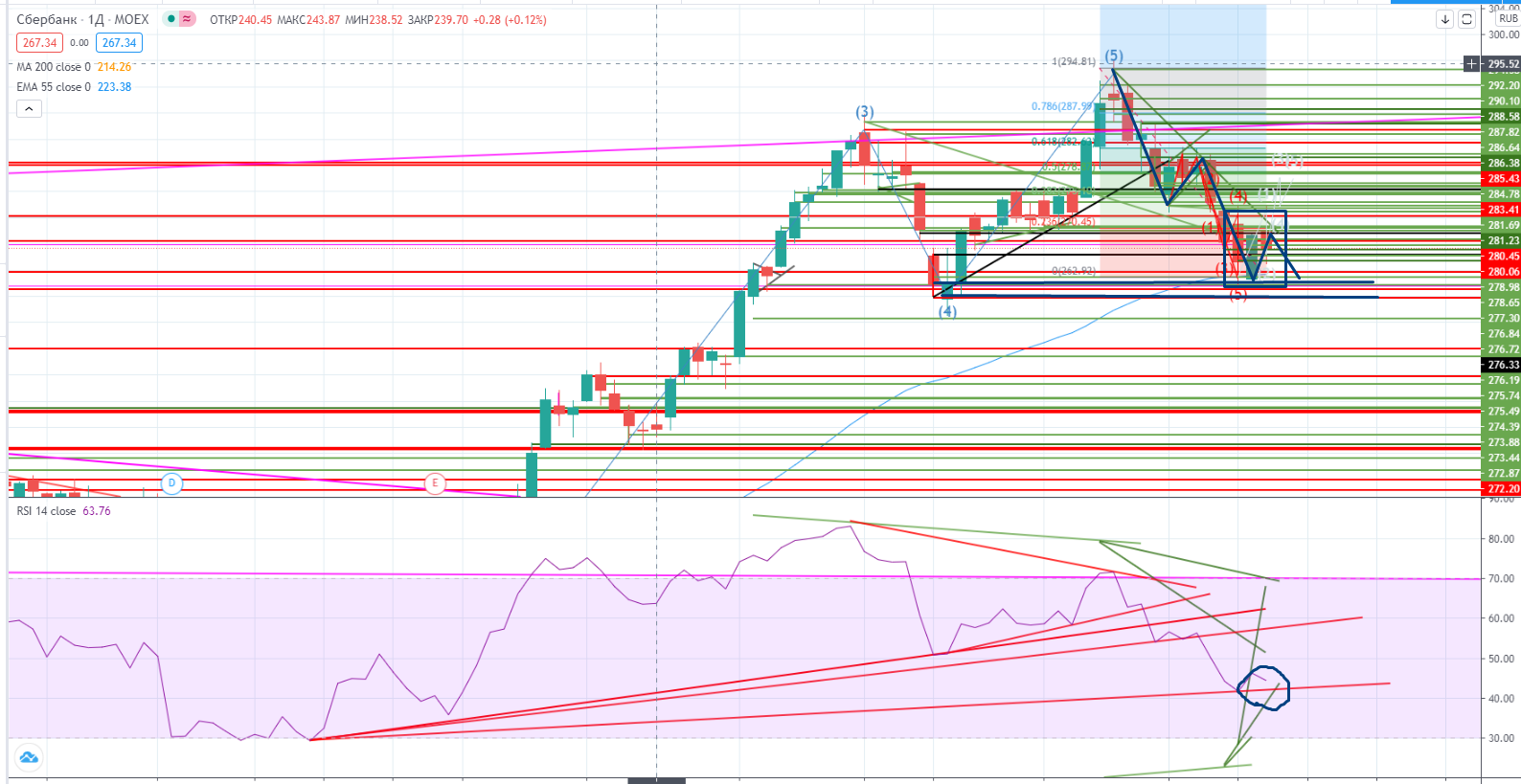 Возможно еще рано об этом говорить, но очень может быть в Сбере зарождается 3-я волна РОСТА (Т-с-с) в коррекционной волне В. 5-ть волн видны, дивергенция видна… Так что все возможно… И если это так, то при проходе уровня 273,11+ можно покупать… Это только версии происходящего, так сказать «набрасываю».