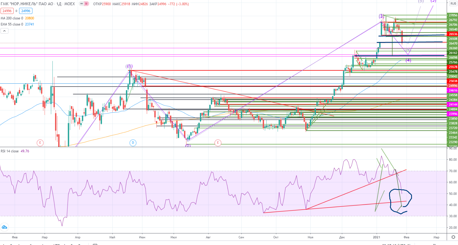 Зато в ГМКН произошло сразу два события. Он не только зашел в уровень гэпа 25024-25608, но и тестил нижнюю границу. Причем дважды (в «основную» и «вечернюю» сессию). Но уровень пока выстоял. По идее надо покупать на уровне 25000±, но надо учитывать, что мишень от пробоя канала на часах может быть =24000± , что примерно совпадает с уровнем поддержки на дневном графике.