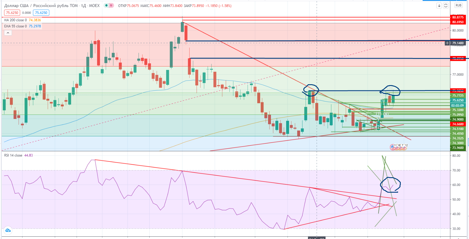 Наш рубль продолжил слабеть. На днях под уровнем 75,91, RSI НЕ ПРОТИВОРЕЧИТ продолжению роста. Если доллар пройдет 76+ очень возможен поход к гэпу 78,1-79,34. Нужно очень внимательно смотреть на это...