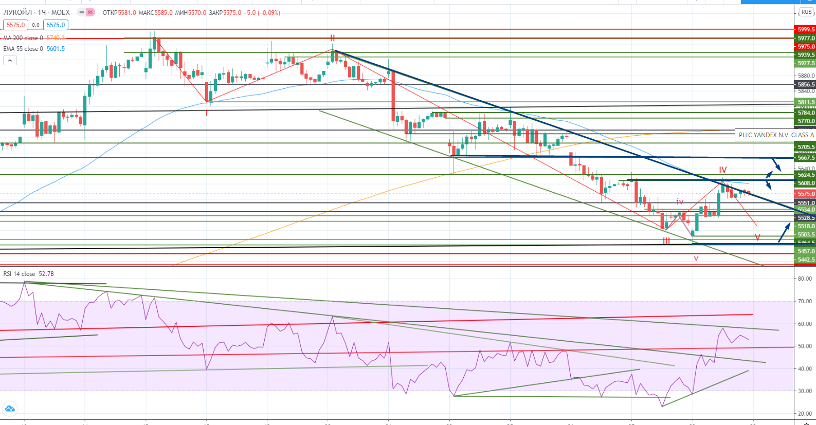 В Лукойле на часах формально выполнено 5-ти волновое падение. Пока в нем куча вопросов. Меня лично очень смущает короткость V-ой волны. И если это так, то есть свободная зона для роста, при проходе 5610+ есть шанс дорасти до 5673, на котором можно продавать.