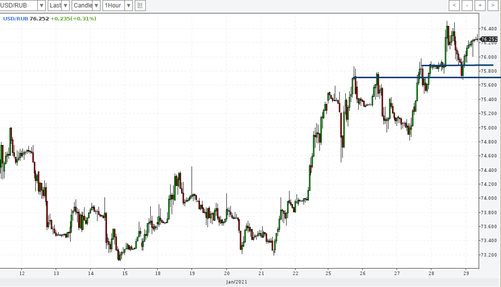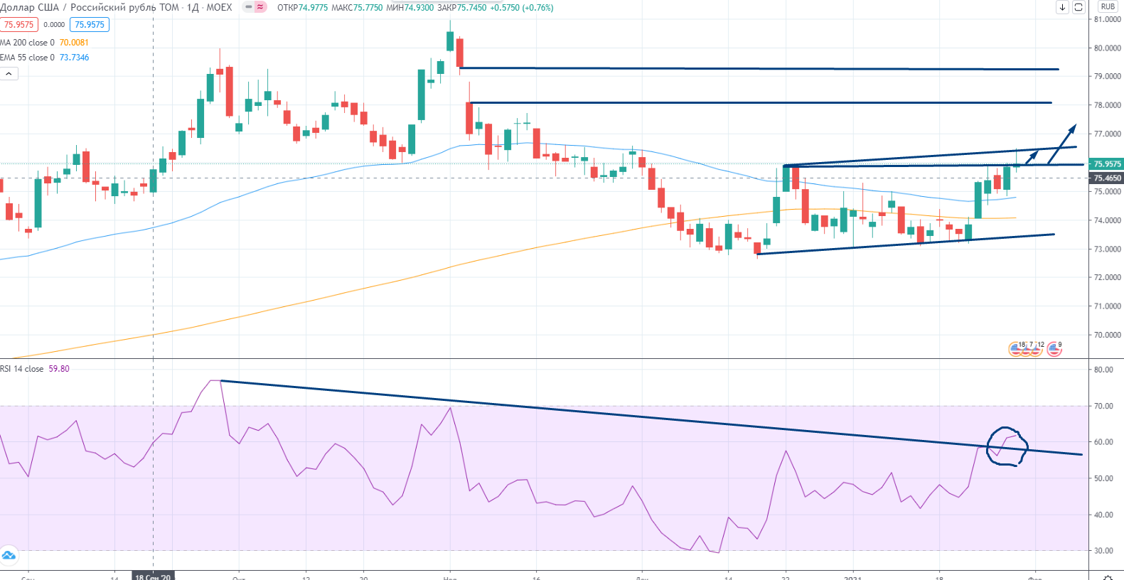 Пара USDRUB на дневном графике возможно торгуется в канале, который мы вчера тестировали снизу. Но пока не пройден уровень 75,91 лонг уместен, RSI пока не противоречит этому.