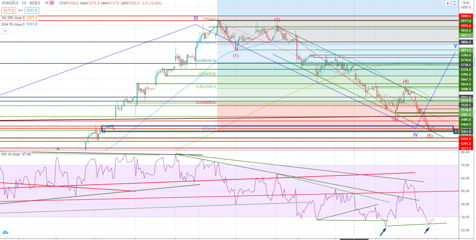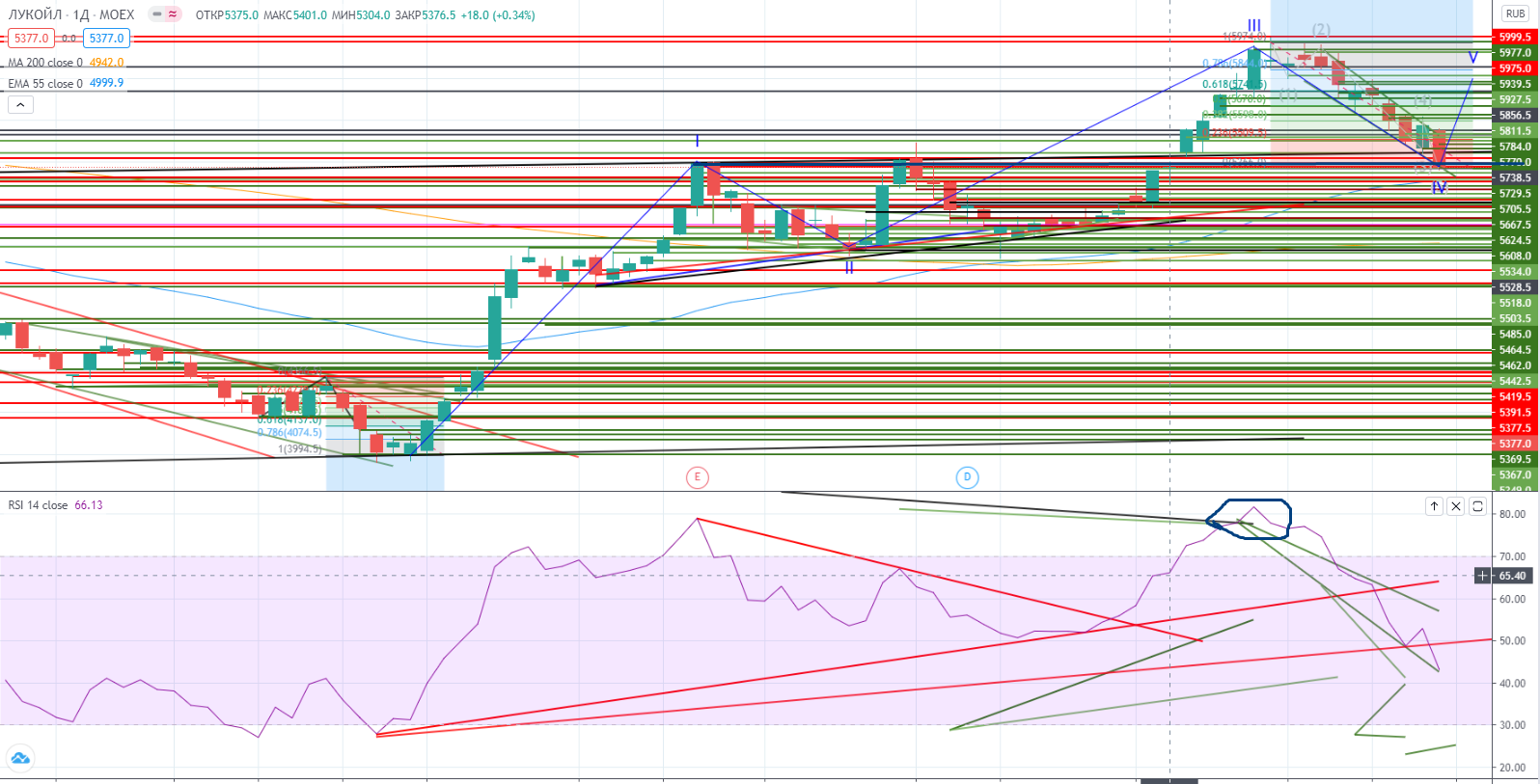 Но на днях закрылся на реперном уровне только (!) I-ой волны роста (я понимаю, что это выглядит абсурдно, но я так вижу (не было дивергенции на III-ей волне). Вообще очень неоднозначная картина наблюдается на нашем рынке. Некоторые бумаги нарисовали классический 5-ти волновой рост, с дивергенциями на крайних волнах (Сбер например), а некоторые только находятся в IV (как Лукойл например, или индекс ММВБ). Такая неоднородность сильно напрягает, что говорит о неопределенности в общем плане. Да и что происходило в Лукойле в последнее время не поддается логике. Такие безоткатные движения вверх и вниз крайне непонятны.