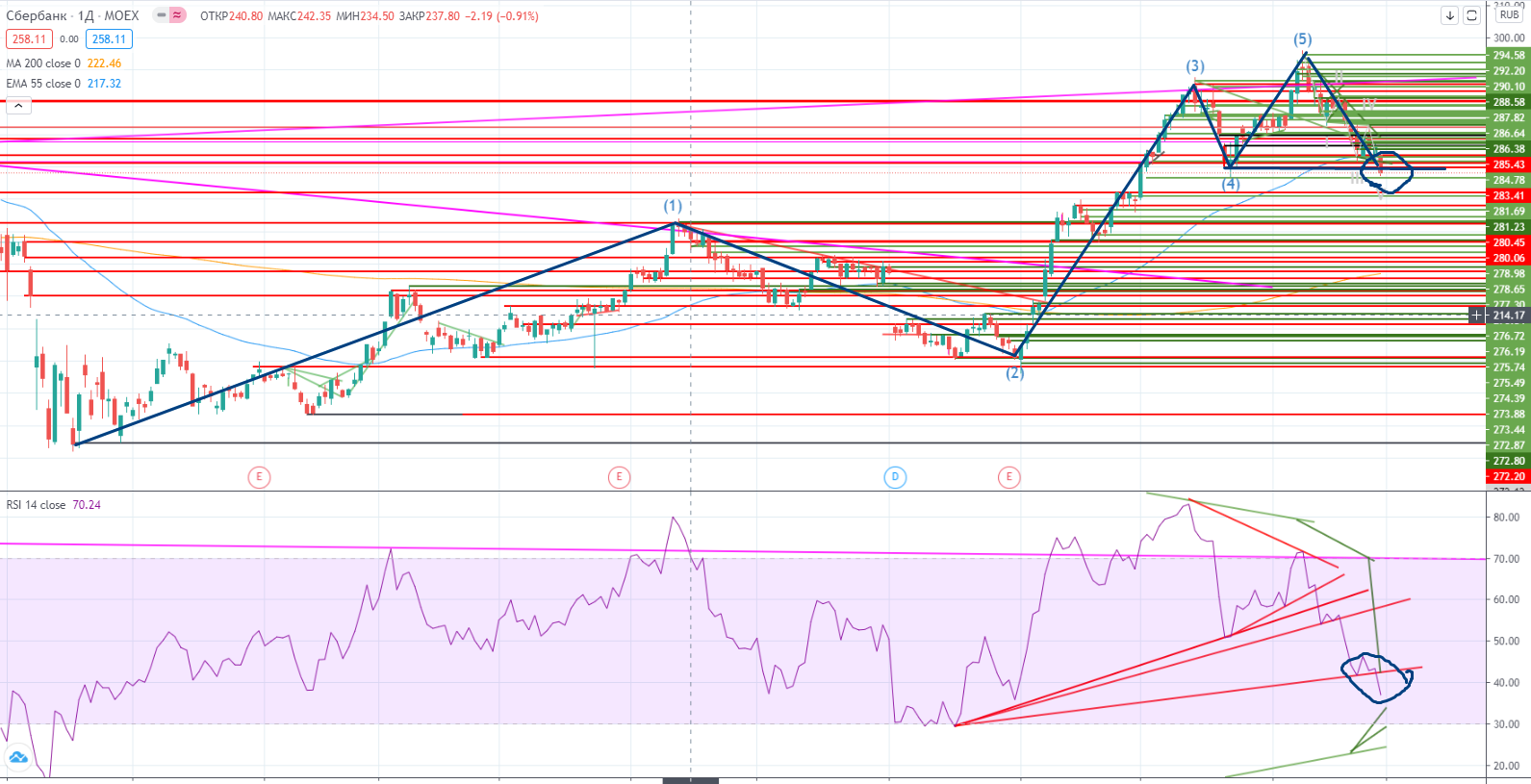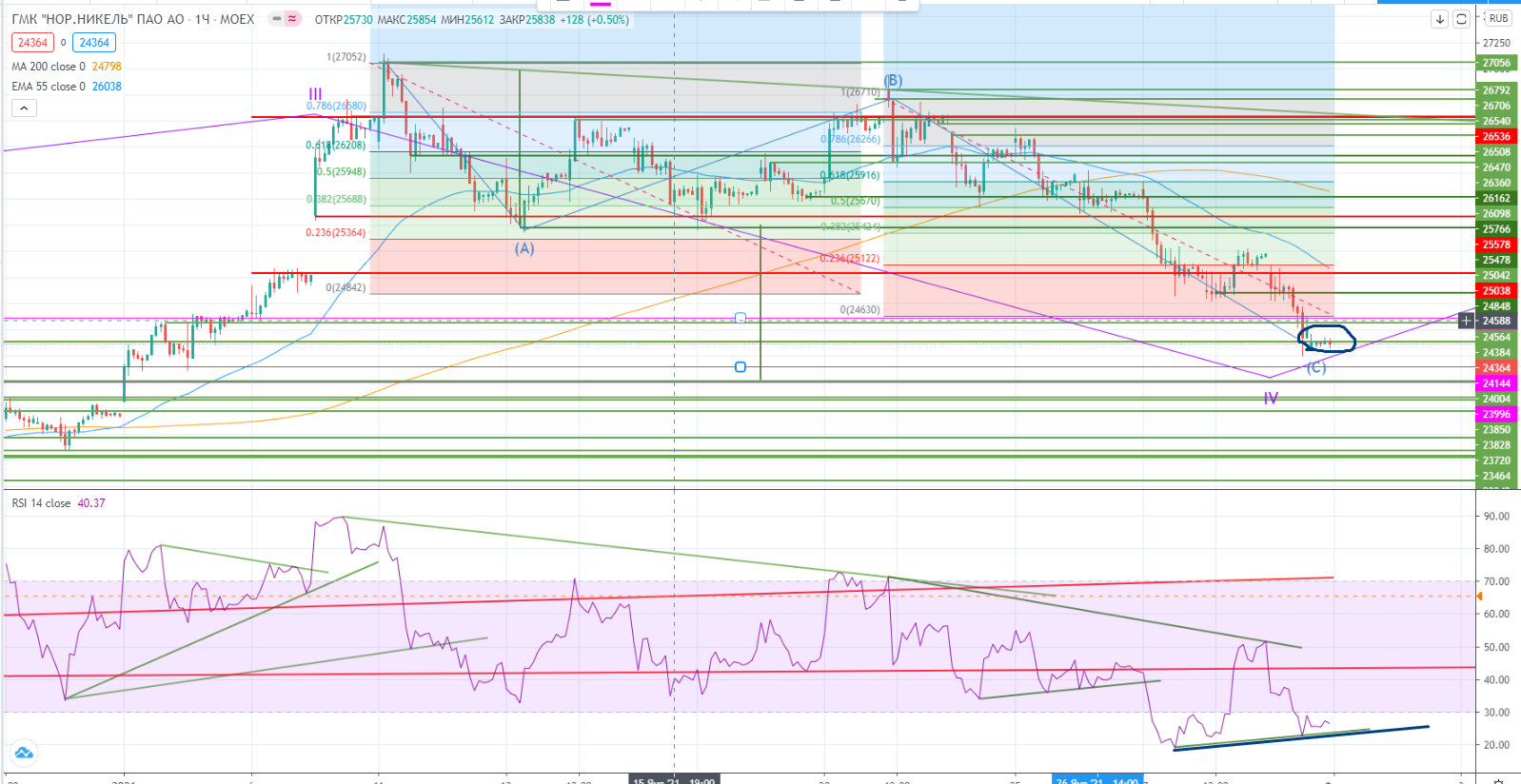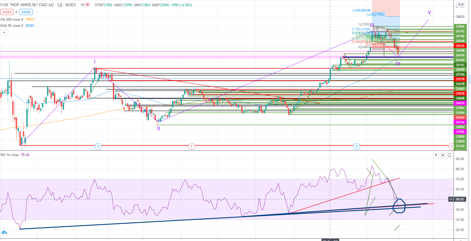 К примеру и в ГМКН тоже находится только в IV волне роста, опять же не было дивергенции на III-ей волне, и почти пришел на уровень поддержки 24000, что примерно совпадает с мишенью от пробоя канала (https://www.finam.ru/analysis/marketnews/ot-dinamiki-na-rynke-segodnya-i-zavtra-budet-zaviset-mnogoe-20210128-09350/) , и совпадает с RSI-ем, который в случае похода ценой туда, упрется в основной дивергентный тренд.