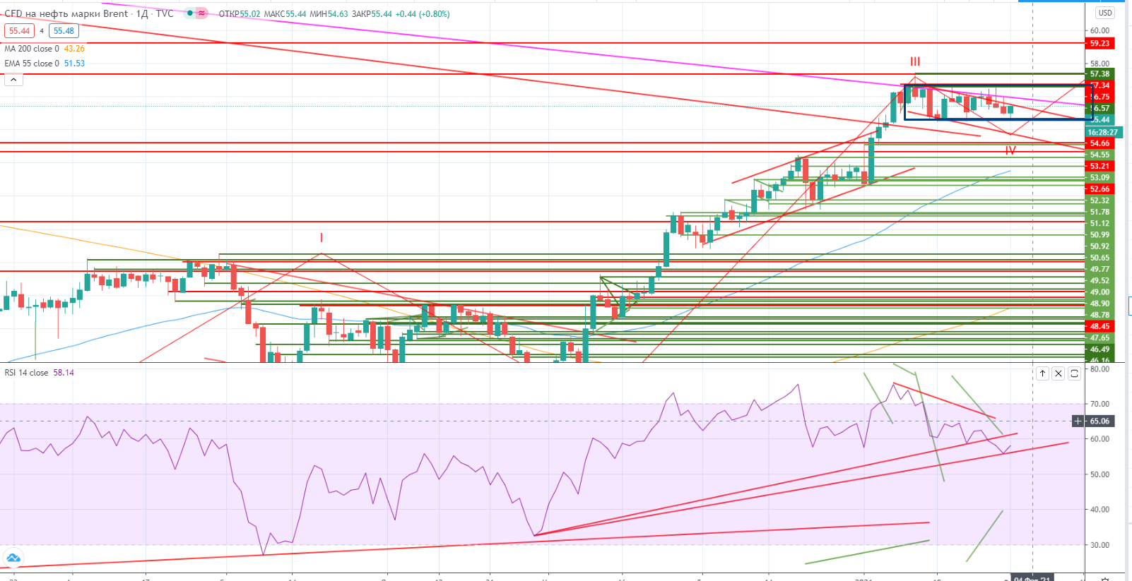 В нефти все пока нейтрально, что может означать в принципе пока отсутствие страха коррекции. На недельном графике нефть продолжает стоять под трендом, а на днях в широком канале $54,7-$56,7, но возможно она рисует и «флаг», и с учетом нахождения пока нефти в IV-ой (коррекционной волне) (я делаю такое предположение на основании отсутствия дивергенции на конце III), а значит можно ждать отскока и формирование V-ой волны роста. Вопрос когда покупать пока открыт. Нужно сформировать и проторговать уровень и необходимо дождаться разворотной формации вверх. Но от шорта чисто спекулятивно можно пробовать торговать при выходе вниз из канала $54,7-$56,7.