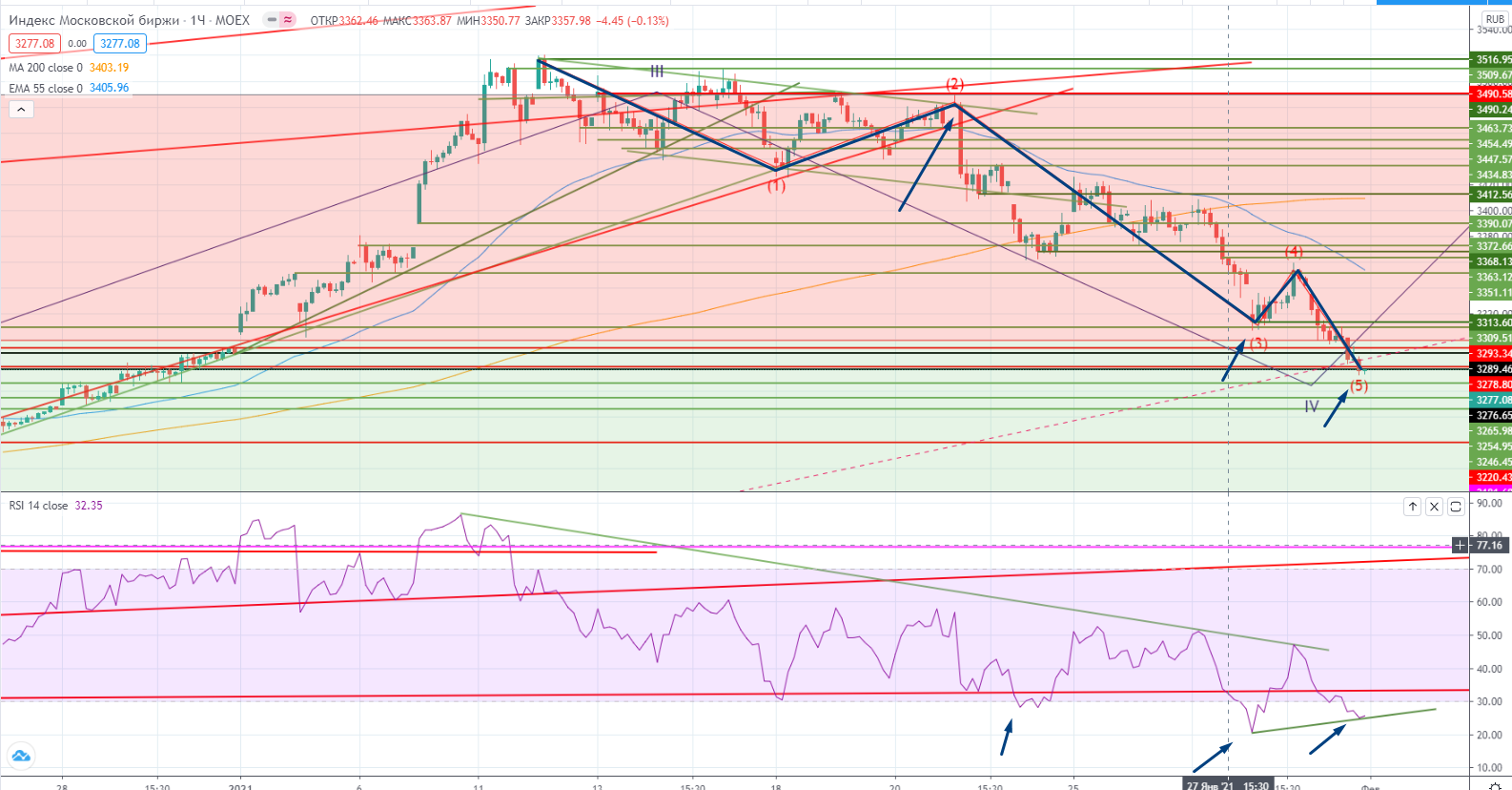 На часах пока тоже все неоднозначно. На мой взгляд индекс находится пока в 5-ой волне коррекции в волне A (между 3-ей и 5-ой пока присутствует дивергенция), но еще раз повторю, ситуация неоднозначная, возможно придется перестраивать волны на этой неделе, а вместе с этим и стратегию торговли. Вообще на прошлой неделе было много вопросов ( https://www.finam.ru/analysis/marketnews/ot-dinamiki-na-rynke-segodnya-i-zavtra-budet-zaviset-mnogoe-20210128-09350/ ), которые пока не разрешились. Однозначный шорт пока не пришел, и это надо понимать, возможно он придет (или нет на этой неделе).