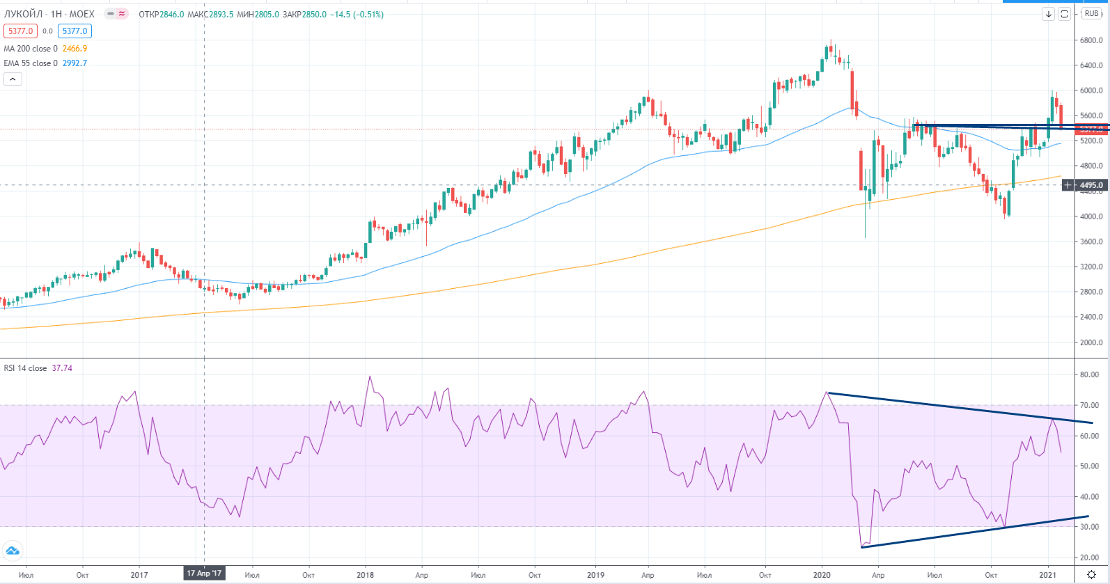 Лукойл на недельных графиках закрылся на локальной поддержке 5370-5380.