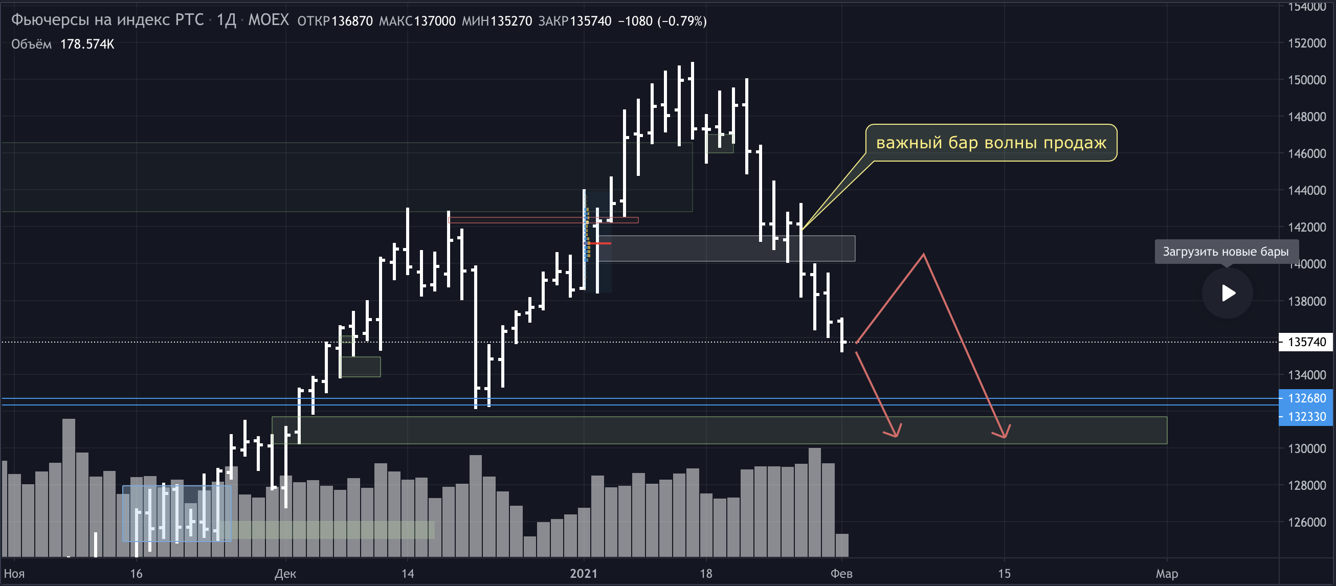 С другой стороны.. и здесь нужно рассмотреть природу cancellation бара: объем огромный, прогресс большой, а последуюущие бары идут в противоход и обновляют хаи. Внутри такого бара скорей всего были лишь лимитные покупки в то время, как продажи были рыночные с привлечением (вовлечением) толпы. Если в данном контексте говорить о баре 28 янв., то здесь присутствует масса рыночных покупок, которые останавливают расширение спреда. Посему, развитие событий может отличаться от того, что было раньше.