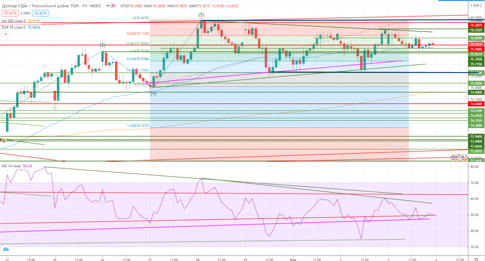 USDRUB на часах торгуется в канале 75,32-76,43. У меня есть там лонг на фьючерсе. Решил не дергаться и остаться стоять. Объем всего 1/4, так что даже в случае исполнения стопа убыток будет небольшой, а в случае пробоя я верну все, что потерял накануне!!! Расчет на это, отношение прибыль/риск очень хороший.