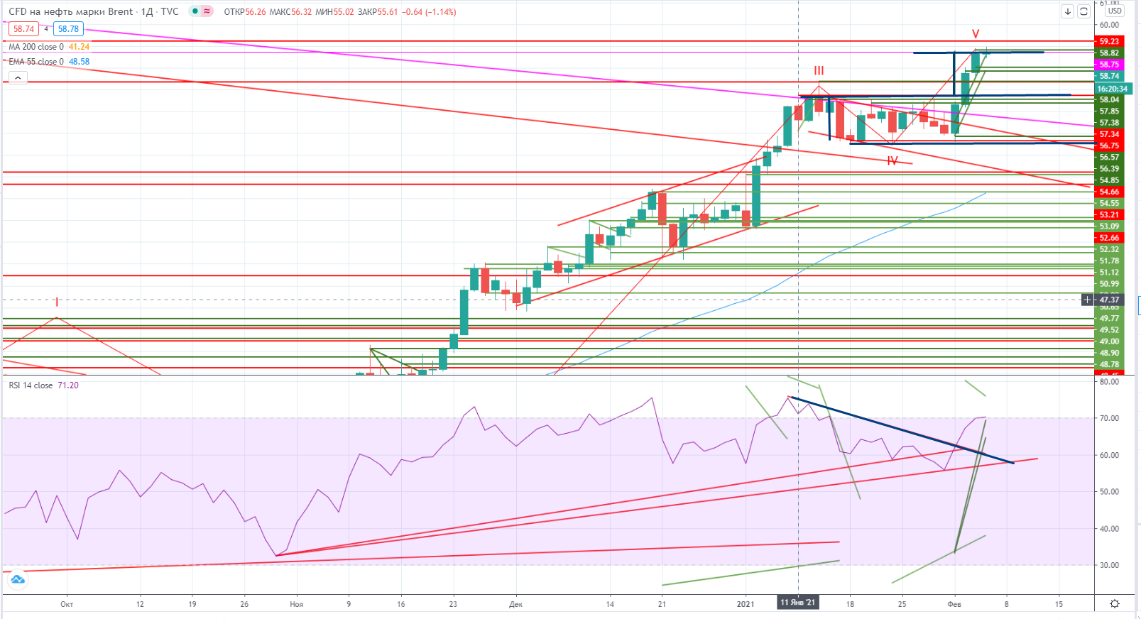 Нефть достигла мишени от пробоя канала (https://www.finam.ru/analysis/marketnews/v-lukoiyle-proisxodilo-chto-to-neponyatnoe-20210203-09350/) ($54,71-$56,7)= 58,7±. Дивергенция присутствует пока, дорисовывается V-я волна роста, так что возможно что коррекция не за горами. Ничто не может расти безоткатно, это надо помнить.
