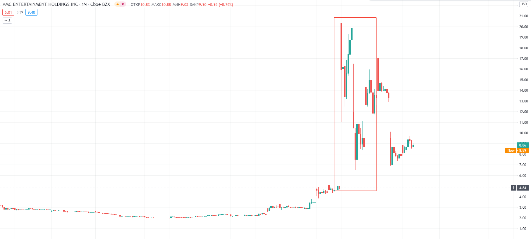 Организаторы в плюсе. Обратим внимание, что до пампа акция стоила 20$ — то есть к пику популярности она уже выросла в 4 раза, и все эти дни организаторам пампа было логично фиксировать кратные прибыли, закрываясь об покупающую толпу (и об фонды, закрывающие свои шорты).