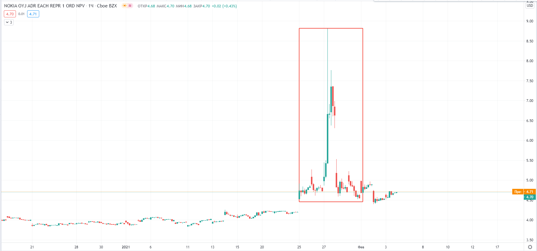 До момента пампа Nokia торговалась в районе 4$. Первый памп поднял цену до 4,5$, а в пиковой точке цена составляла в районе 8,8$ за акцию. Таким образом, средняя цена входа толпы примерно составлял 6$. Закрываясь 29 января, организаторы смогли бы заработать около 15%, в то время как основная толпа потеряла бы от трети до половины своих спекуляций.