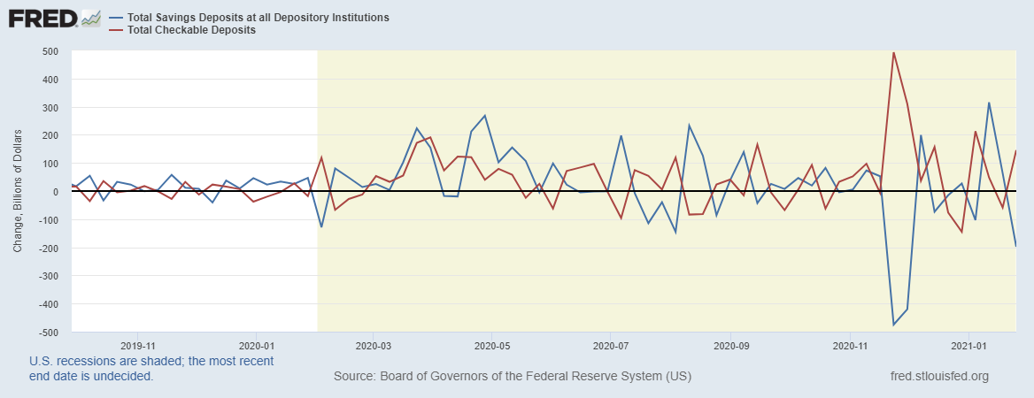 Синяя линия – это динамика от недели к неделе показателя срочных депозитов (сбережения);