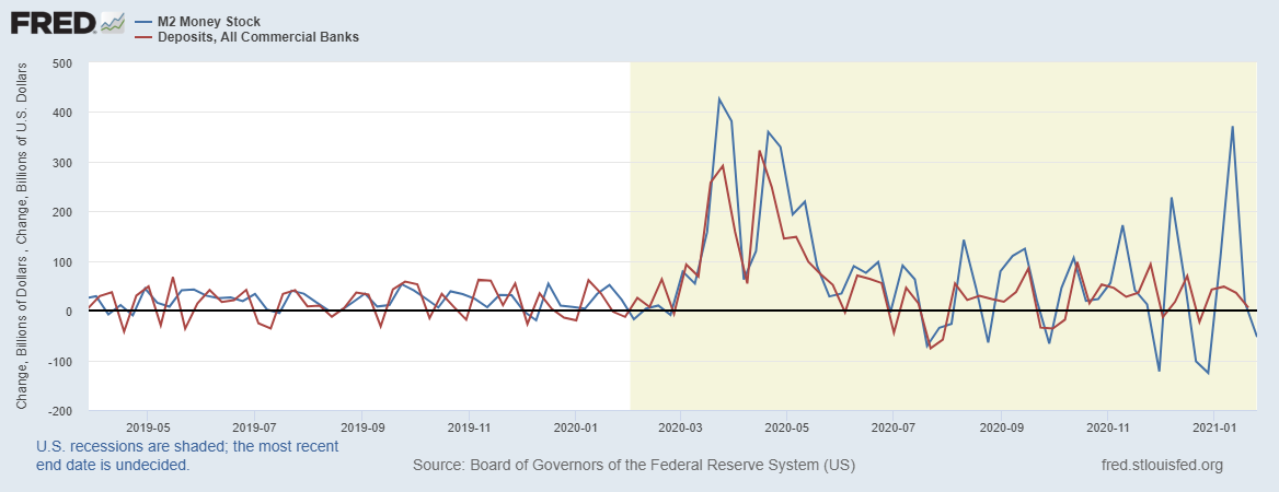 Ввиду роста объемов счетов до востребования М1 резко вырос на 153 млрд долларов, что снова придавило денежный мультипликатор