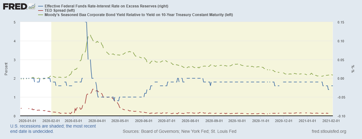Зеленая линия – это разница между доходностью корпоративных 10-летних облигаций и соответствующих трежерис, ситуация на рынке корпоративного долга остаётся стабильной.