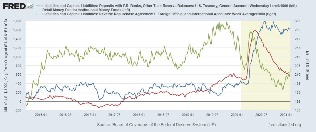 Вообще, ситуация с ростом М1, который начался в ноябре, что-то не так, и с осени показатель вырос на 1,2 трлн долларов, с учетом того, что основной компонент М1 является счета до востребования, т.е. высоколиквидные счета, то можно предположить, что аккумулируется средства для каких-то действий, возможно и для финансовых операций в том числе. Как-то процесс накопления затянулся и деньги остаются в высоколиквидном состоянии, т.е. не приносят процент.