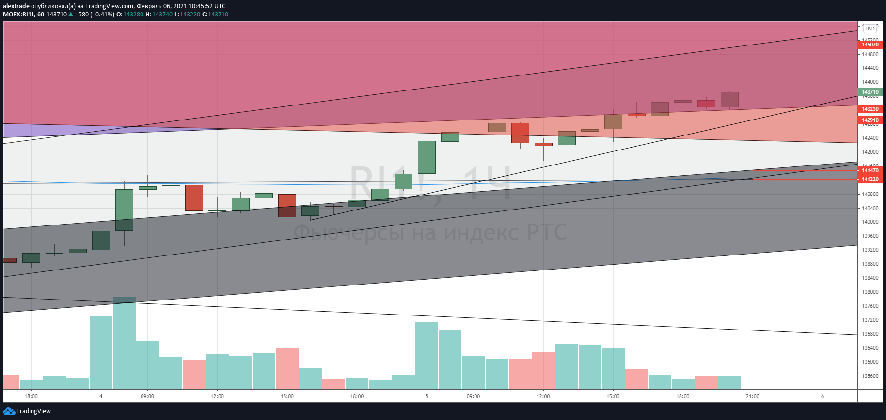 Фьючерс на индекс РТС (ри) (+5,85%), закрытие 143 710, макс 143 740, мин. 135 770, еще 1 числа покинул основной даунканал, в котором шло снижение, пост (https://t.me/pro_dengu/2414) , это ознаменовало начало коррекции вверх, которую мы наблюдали все оставшиеся дни недели. Закрытие вечорки пятницы 143 710, выше сопротивления 143 160, но основная сессия закрылась на 143 030 под сопротивлением. Был отбой вниз от сопротивления в пятницу до 141 710, который тоже читался из графика, выбило у меня часть шорта от 142 900, он плюсовал в середине дня. У сопротивления наклон вверх. Картина локальная не очень хорошая для медведей на конец пятницы (4 часовых свечи вечорки), но даже при этом локальный удар вниз на 141 000 -141 500 еще впереди, а там посмотрим. (на графике снизу бои в Ри в пятницу)