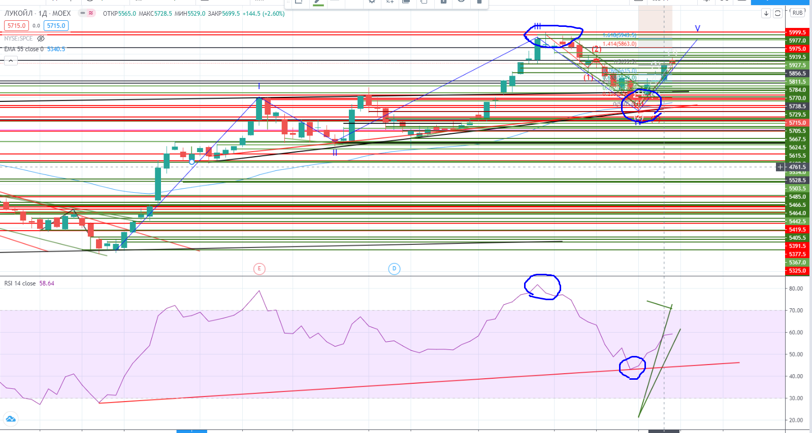 В Лукойле на днях не было дивергенции ни наверху (5937), ни внизу (5377), так что по daily ничего пока сказать нельзя. Максимально непонятная бумага из мною торгуемых.