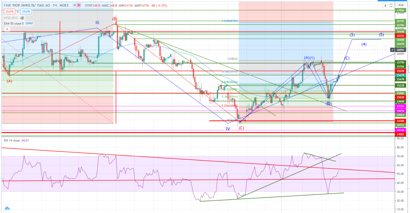 В ГМКН наконец-то состоялся суд над компанией, который принудил заплатить штраф 146 МЛРД рублей. Иск РОСПРИРОДНАДЗОРА частично удовлетворен. На этом акции компании пошли отпадать. Но с точки зрения волн все-же можно подбирать акции в зоне 24000-24400. Не было и здесь дивергенции на лоу, а значит поход туда еще раз возможен. Выполнена мишень от пробоя канала ( по классике по закрытиям =24600, по телам=24216).