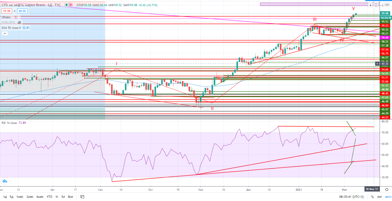В нефти пока находимся в V-ой волне роста (RSI пока в зоне потенциальной дивергенции и снова в зоне перекупленности). Но и здесь ситуация может быть изменена. Возможно нужно будет перестраивать и тут волны, возможно что это только III-я волна, а значит рост может продолжится. Но тем кто стоит в ней в лонге -можно продолжать стоять и дальше. Можно поставить защитный тэйк профит при формировании, проторговки и появления разворотной фигуры на каком либо уровне, но его пока нет.
