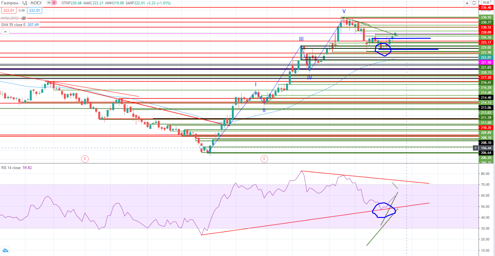В Газпроме тоже не было дивергенции на лоу. Вокруг Газпрома на неделе выходили противоречивые новости. То американцы дадут достроить СП-2, то не дадут, Европа тоже не понятно как отреагирует на это. Ведь в этот проект уже вложены деньги и ими. Очень непонятная бумага, в ней можно скальпировать, но накоротке, так сказать «сделал сделку-поймал профит-ушел». Вот и сейчас прошла информация «СУДНО-ТРУБОУКЛАДЧИК «ФОРТУНА» ЗАВЕРШИЛО МОРСКИЕ ИСПЫТАНИЯ И 6 ФЕВРАЛЯ НАЧАЛО УКЛАДКУ «СЕВЕРНОГО ПОТОКА — 2» В ВОДАХ ДАНИИ». Но опять же, я и раньше не сомневался, что «СП-2» достроят, но и опять же есть сомнения (https://www.finam.ru/analysis/marketnews/akcii-sberbanka-v-plane-rosta-vyglyadyat-perspektivnee-gazproma-20210104-10550/) — « «То, что „Северный Поток -2“ будет достроен я не сомневаюсь. Об этом я писал несколько раз. Но, во-первых, в Европе готовят документ о невозможности использовать этот трубопровод единственной компанией, т.е. даже если газопровод построят далеко не факт, что „Газпром“ будет монополистом в нем. Во-вторых, еще вопрос с санкциями от США пока открыт, а это тоже будет „давить“ на цену. Ну и конечно, этот вопрос с газификацией страны за счет „Газпрома“, т.е. акционеров. Риски очень большие, и несопоставимые с возможной прибылью, на мой взгляд».»