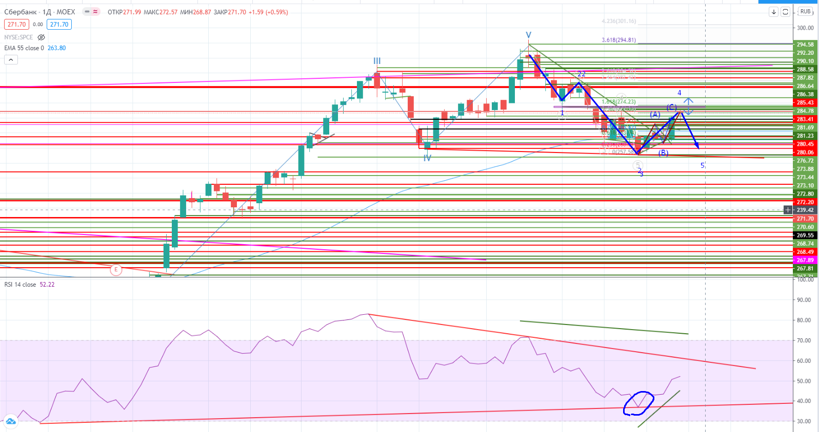 Сбер на часах пока формирует коррекцию от падения ABC, которая может нарушится при проходе выше зоны 273,11 (окончание 4 волны)-273,9 (окончание 1 волны). Пока в приоритете шорт, но при проходе выше реперной зоны можно торговать снова от покупки.