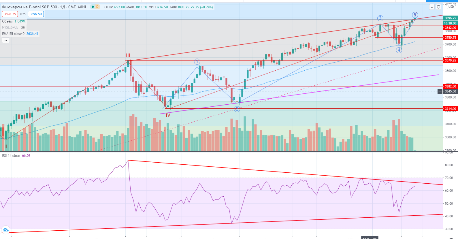 Оценивать график просто невозможно. С точки зрения волн ситуация алогичная. По классике 5-я волна не может быть такой сильной, но мы это имеем. Дивергенция растет, в V-ой волне мы находимся в 5-ой подволне (сам запутался) (на крайней тоже есть дивергенция), и цена пришла снизу к тренду, но нелогичность американского рынка может привести к перерисовки волн и продолжению роста...