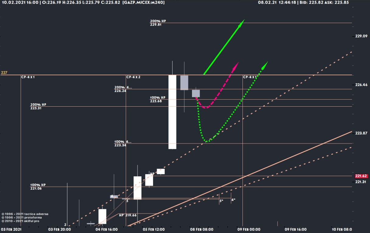 "Фортуна" начала укладку трубы "Северного потока — 2" в водах Дании, мы не знали точное время "Ч" операции, но по расстановки кораблей в море определили возможные сценарии поведения цены акциии Газпром, 4-х часовой план, отработка, +7% за неделю: