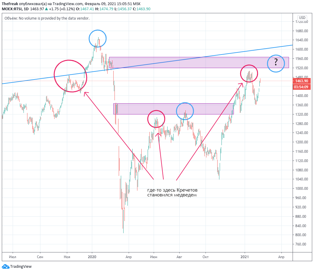 В этой связи, очень интересна история прогнозов Кречетова. Сразу скажу, Кречетов - один из самых сильных публичных рыночных прогнозистов в мире (совершенно серьезно), и возможно самый сильный в России. Но он регулярно спешит с максимумами примерно на 1-2 месяца. Это было в конце 2019, летом 2020.