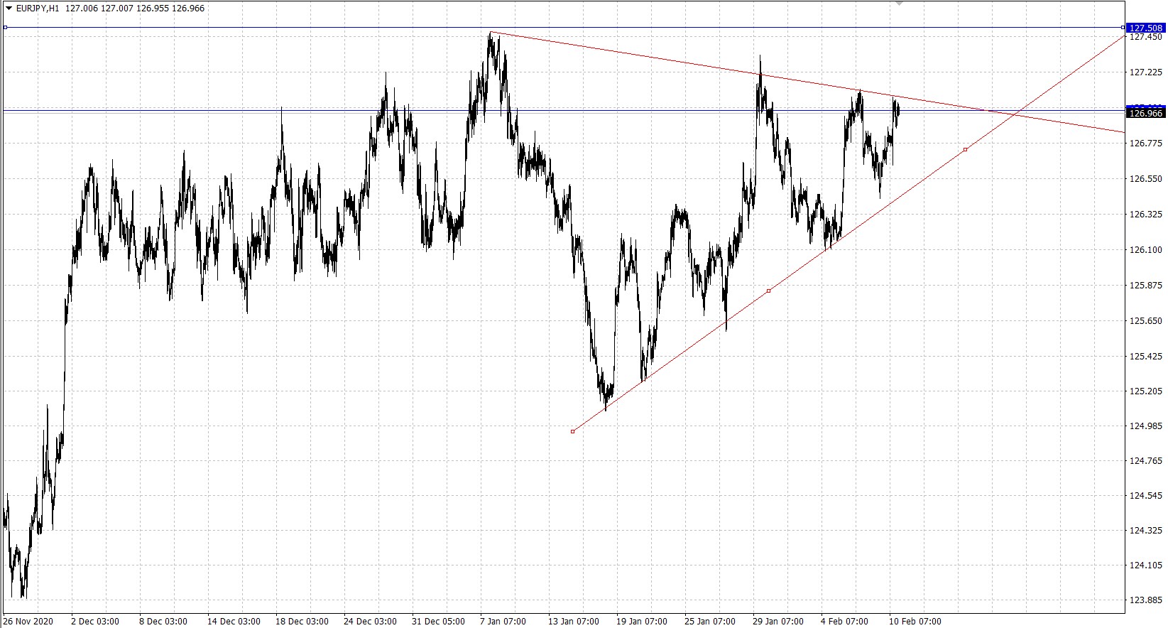 Ну и с технической точки зрения по этой паре сейчас происходит затухание волатильности. Уже 2,5 месяца пара болтается в боковике. Я думаю, выход из него будет вниз. Стоп поставлю за последний максимум в районе 127.5-127.6