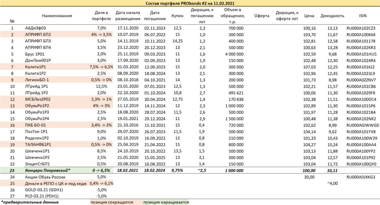 На следующий четверг 18 февраля запланировано размещение облигаций Концерна Покровский (ИК Иволга - Концерн Покровский (размещение облигаций 18.02). Оценка финансовых показателей группы компаний (profitgate.ru)) (эмитент – Племзавод «Победа», 1 млрд.р., купон/доходность 9,75%/10,11%). Облигации будут добавлены в портфели на 7-6,5%. Под это приобретение сокращается ряд облигационных позиций (см. таблицы), а остаток позиции в СК «Легион» выводится из портфеля полностью. Сокращение позиций пройдет постепенно, в течение предстоящих недели-полутора. Незначительно уменьшится и денежная позиция портфелей. Однако свободные деньги в обоих портфелях останутся на случай хеджирования или покупки тех или иных просевших облигаций.