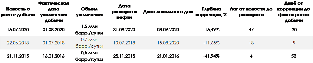 Логика таблицы: после объявления новости о росте добычи странами ОПЕК или отдельным игроком нефть продолжала расти. Однако в 2 из 3 случаев она начинала падение после фактического возвращения объемов на рынок. Последнее крупное увеличение добычи со стороны Саудовской Аравии ожидается в начале апреле. Отсюда и ожидания снижения котировок. Источник.