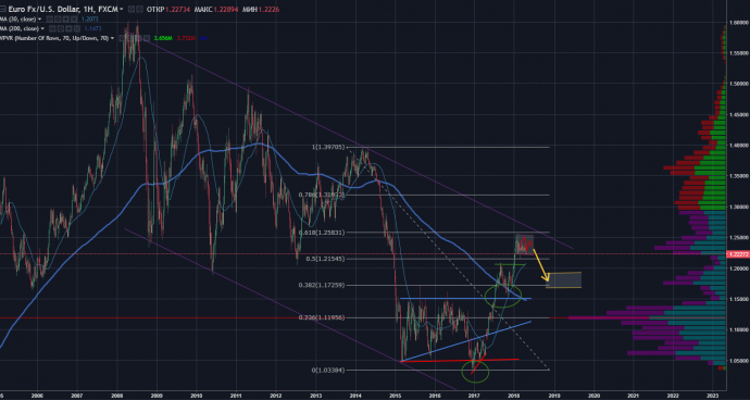 Также хотелось бы отметить, что 1,26 доллара за евро было крайне значимым уровнем для этой пары – данная точка соответствовала отскоку по Фибоначчи в 0,618. Также текущий торговый диапазон достаточно близок к верхней границе нисходящего коридора, в котором пара находится с 2008 г.