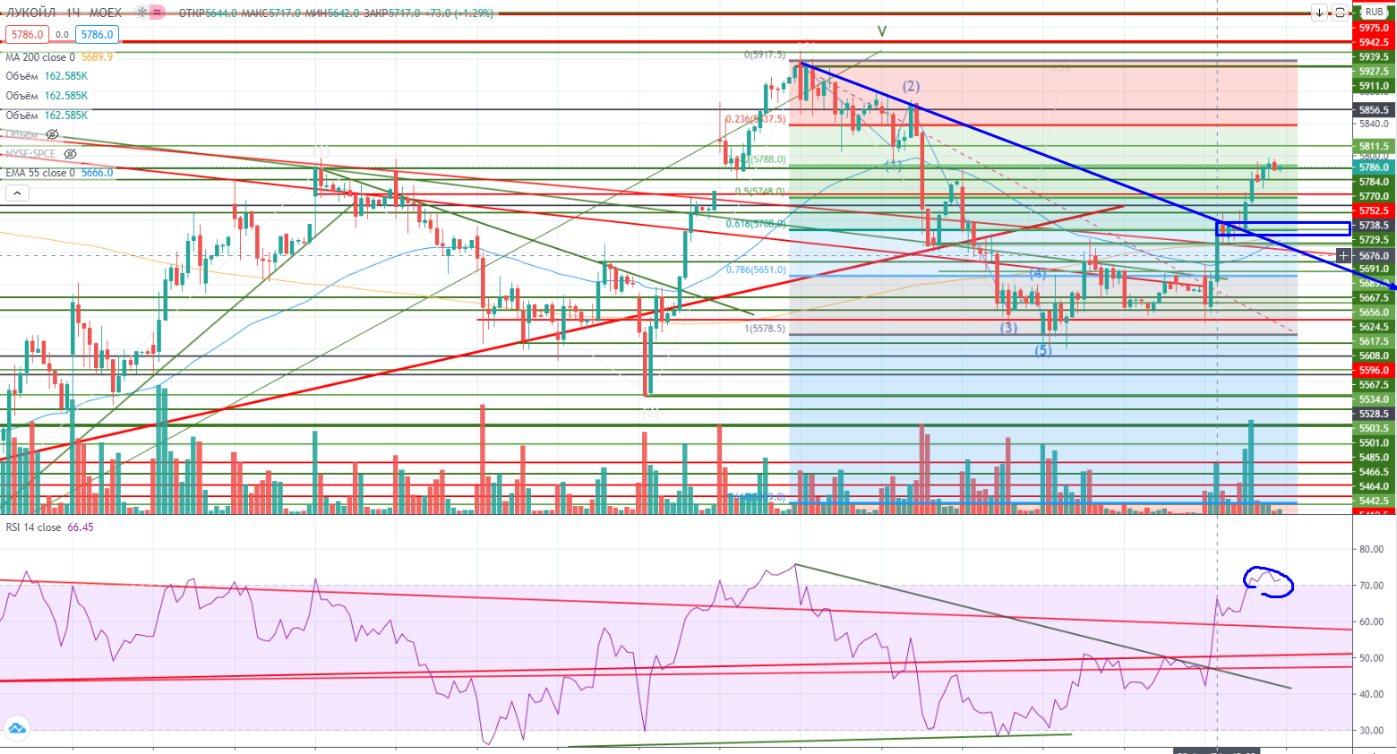 Лукойл отбился от зоны поддержки 5576-5594 т отправился тоже вверх. Теперь в нем нужно торговать от лонга, но не на нынешних уровнях. RSI на часах в зоне перекупленности, зона поддержки 5700-5747 (горизонтальная зона проторговки плюс пробитый тренд). Но хочу напомнить, про пока абсолютную нелогичность поведения Лукойла, и следовательно нужно торговать уменьшенными объемами или не торговать совсем на данном этапе.