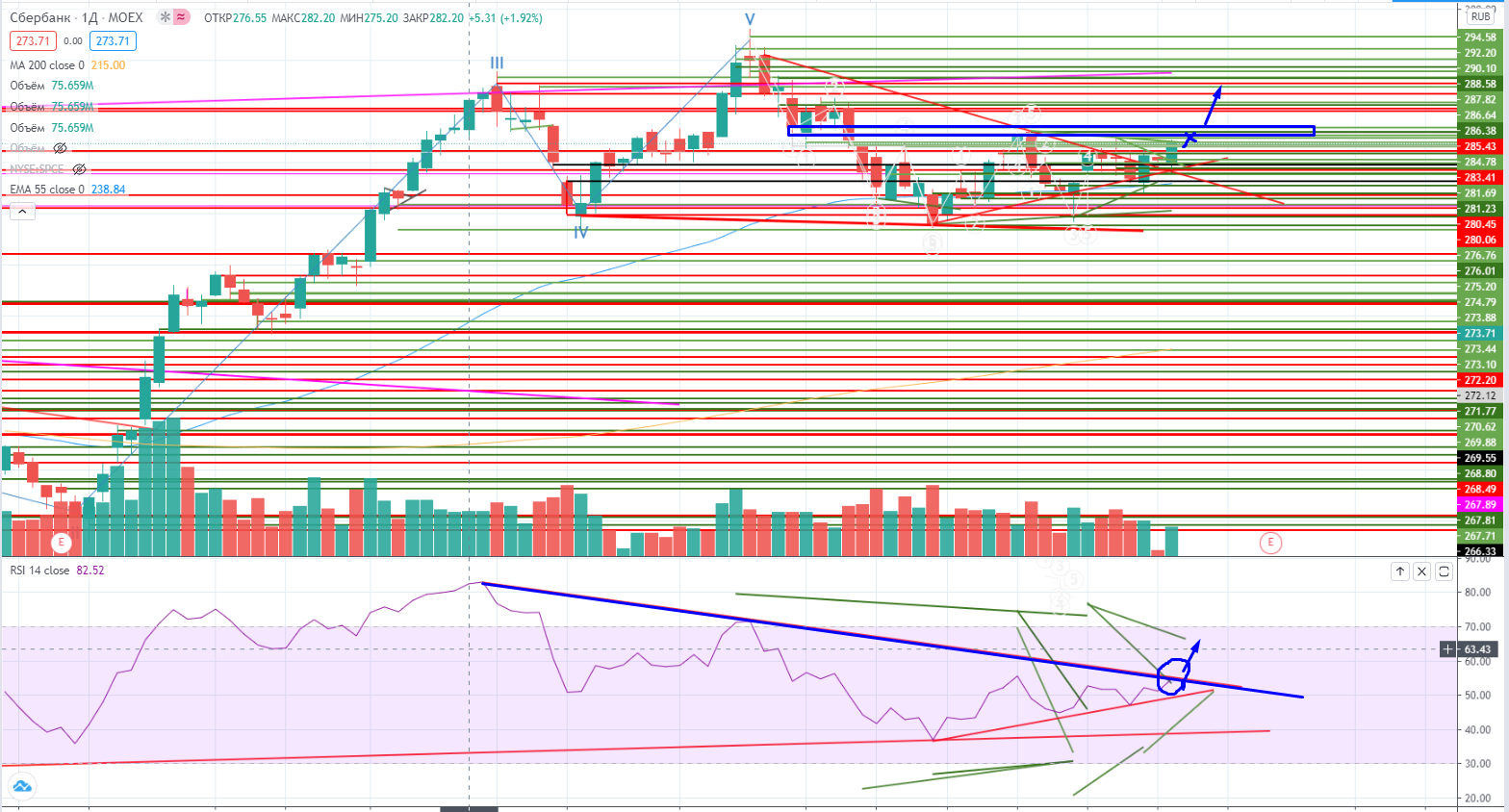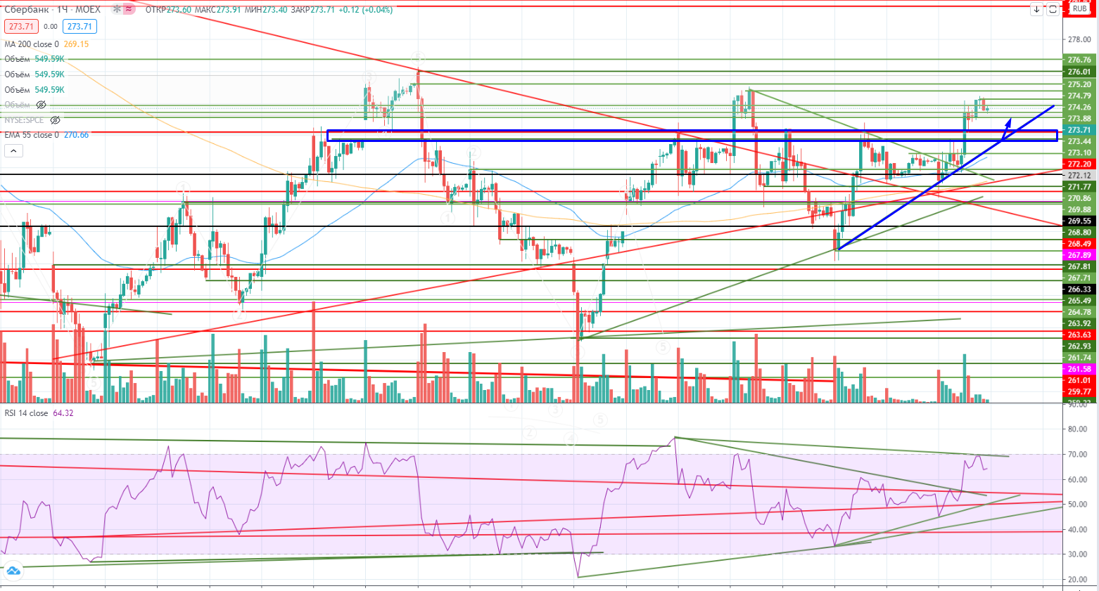 Сбер пробил все-таки падающий тренд и пошел рост. Теперь на дневных графиках он подошел к очень сильной зоне сопротивления 275,2-276,9. RSI прямо пришел под тренд, и в случае прохода этого уровня может произойти дальнейший рост.
