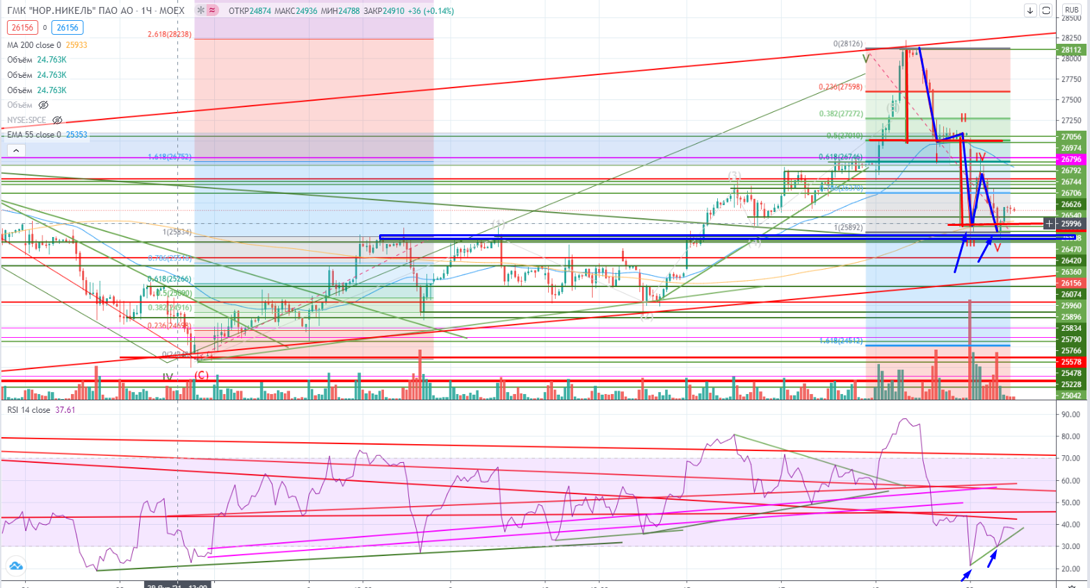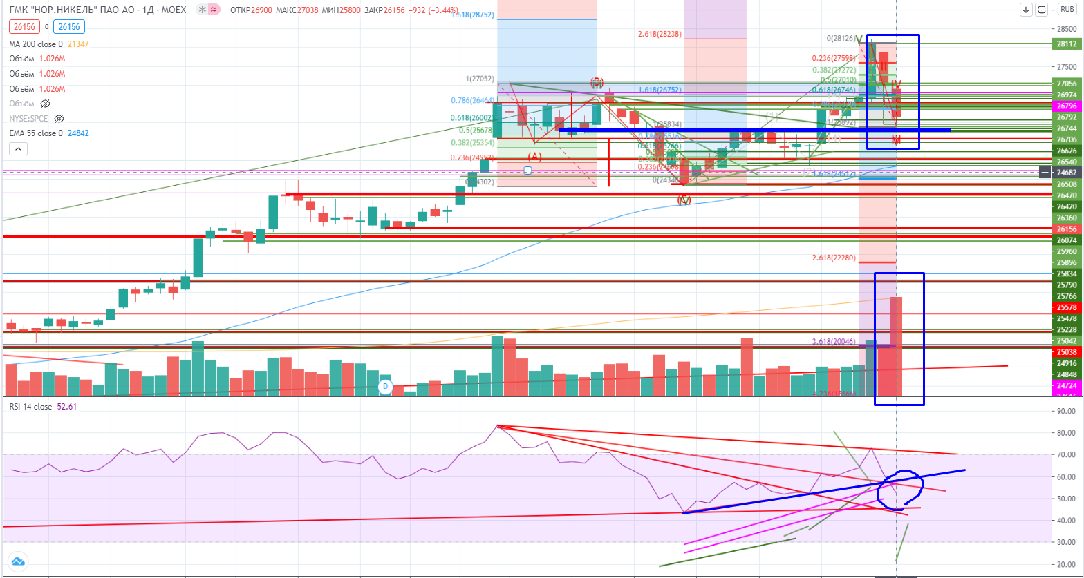 В ГМКН распродажа продолжилась на фоне очередной аварии. Формально крайний импульс поглотили в два дня, формально опять-же исполнен крайний импульс в V-ой волне. Но есть достаточно мощный уровень поддержки 25800+, с прохода которого начался крайний импульс. Выполнена (формально тоже) на часах 5-ти волновая коррекция, мишень тоже сработала, в нем ситуация продолжает быть запутанной. Можно торговать пока в обе стороны, но от уровней и небольшими объемами.