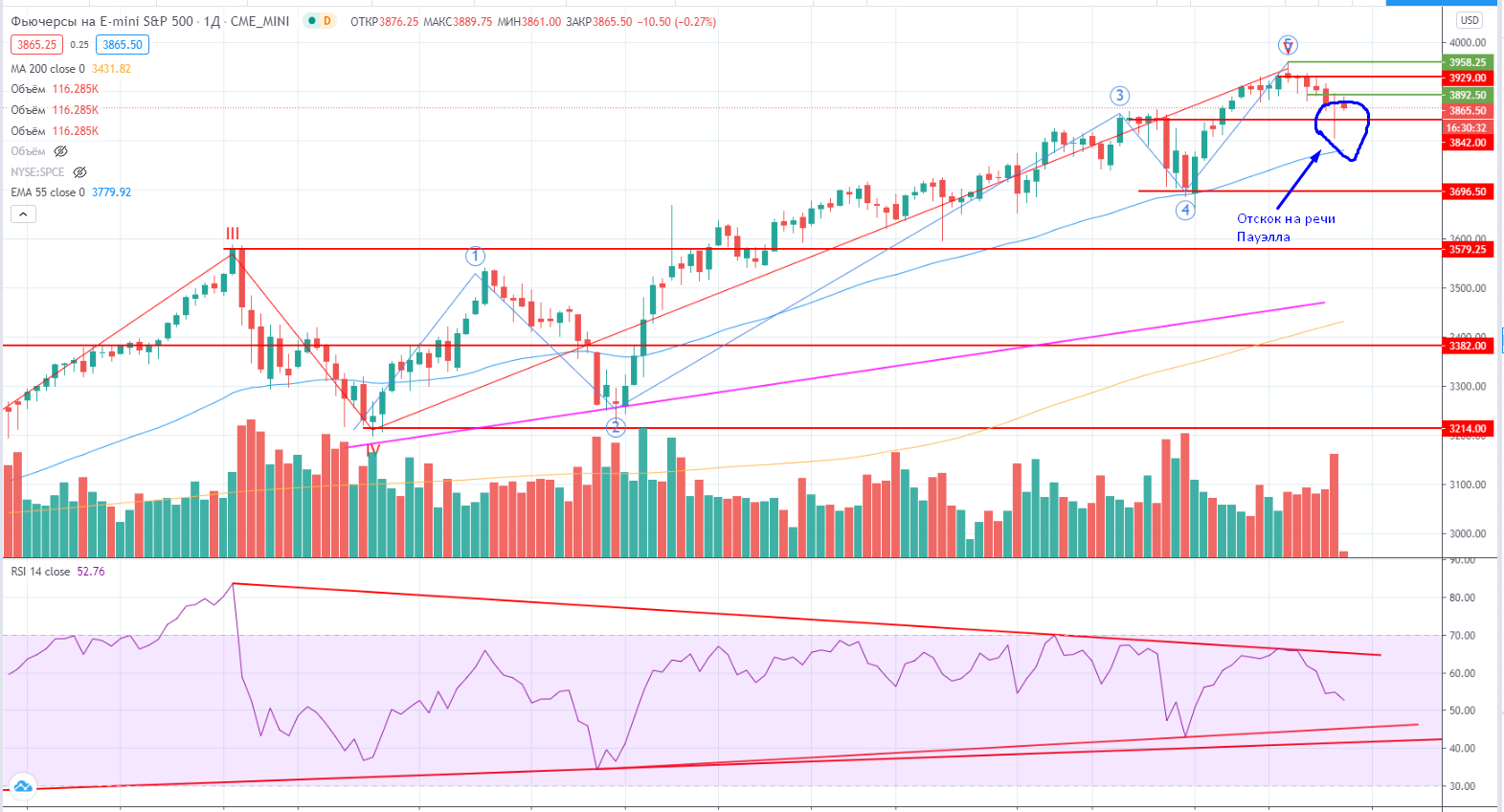 Фьючерс S&P продолжил падать. На речь Пауэлла вчера был отскок вверх, но в целом динамика все таки негативная. Вот тезисы речи Пауэлла - — ИНФЛЯЦИЯ — KEEP CALM