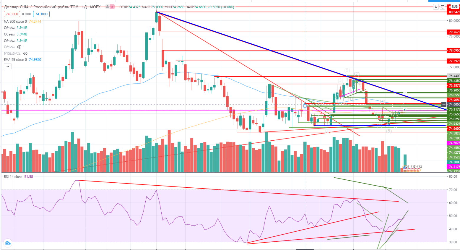Ситуация в рубле также запутанная. В понедельник на фоне начала коррекции в нефти и опасения введения санкций от EC, рубль пошел дешеветь. Но в моменте санкции оказались «снова ни о чем», а на росте нефти пара легла на полку. Что-то странное и непонятное происходит и в валюте. Я решил купить на фьючерсе доллар, немного, всего на ¼ от отведенной суммы на спекуляцию валютой. Ну не верю я в крепкий рубль, и все. Посмотрю, может эта скальперская позиция перерастет в полуинвестиционную, но при проходе ниже 72,8- ее скорее всего закрою.