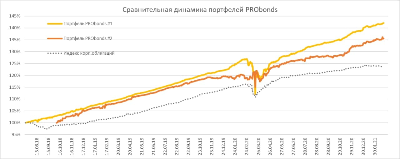Доходности публичных портфелей PRObonds, рассчитанные за последние 365 дней, составляют 12,0% для портфеля #1 и 13,9% для портфеля #2.