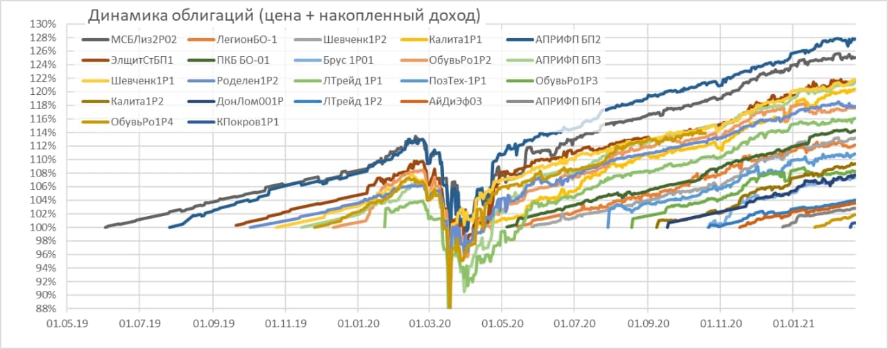 Несмотря на таргет доходности портфелей на текущий год в 12%, сама высокая доходность сейчас не является приоритетной целью. Оба портфеля в 2018-20 годах показывали среднюю доходность выше 14% годовых (после вычета НДФЛ – около 12,5%), и ее возможное проседание в наступившем году допустимо. Приоритет для портфелей – минимизация дефолтных рисков. Поэтому доля крупных компаний и облигаций с более низкими ставками продолжит расти.