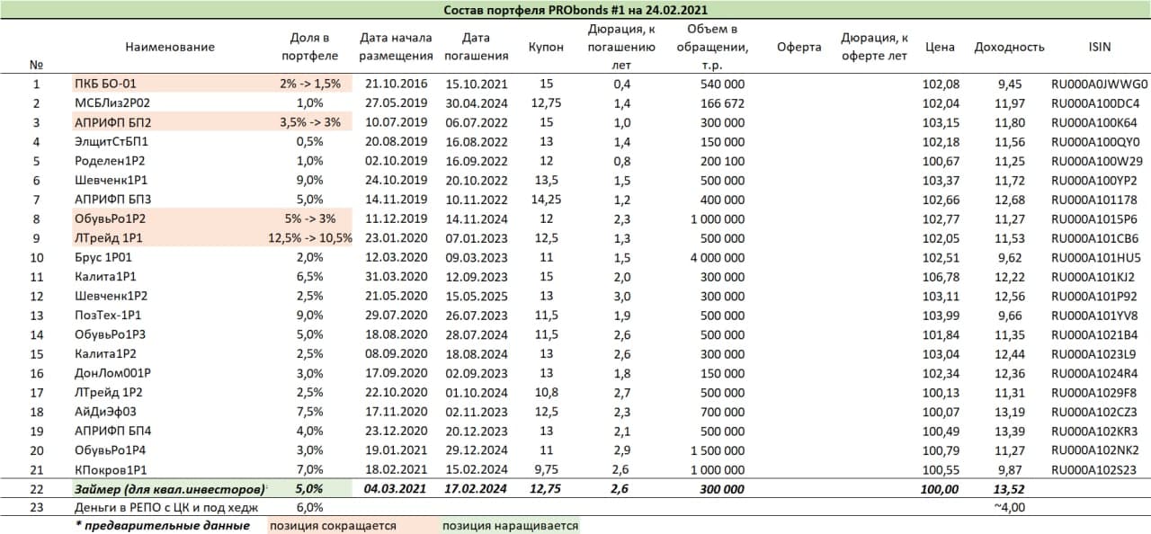 В портфелях за последние пару недель произошли облигационные замены. Добавились облигации Концерна Покровский, размещение которых прошло 18 февраля. Для этого полностью были выведены облигации СК «Легион» и «Талан-Финанс», в первом случае из-а приближения оферты, во втором – из-за очередной амортизации, которая снизит доходность (цена сейчас 103,5%, амортизация пройдет по 100%); ряд других облигационных позиций частично сократились.