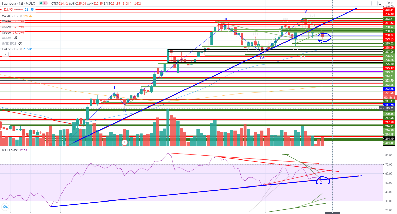А вот Газпром на днях под трендом, RSI пробил тоже свой дивергентный тренд, но есть уровень поддержки 221,35, если ее пройдет, то падение может ускорится… И на часах он под зоной продажи «226,7-227 выглядит пока неприступно. Но при проходе этого уровня необходимо конечно исполнять стоп и возможно даже вставать в лонг.» Так что все логично.