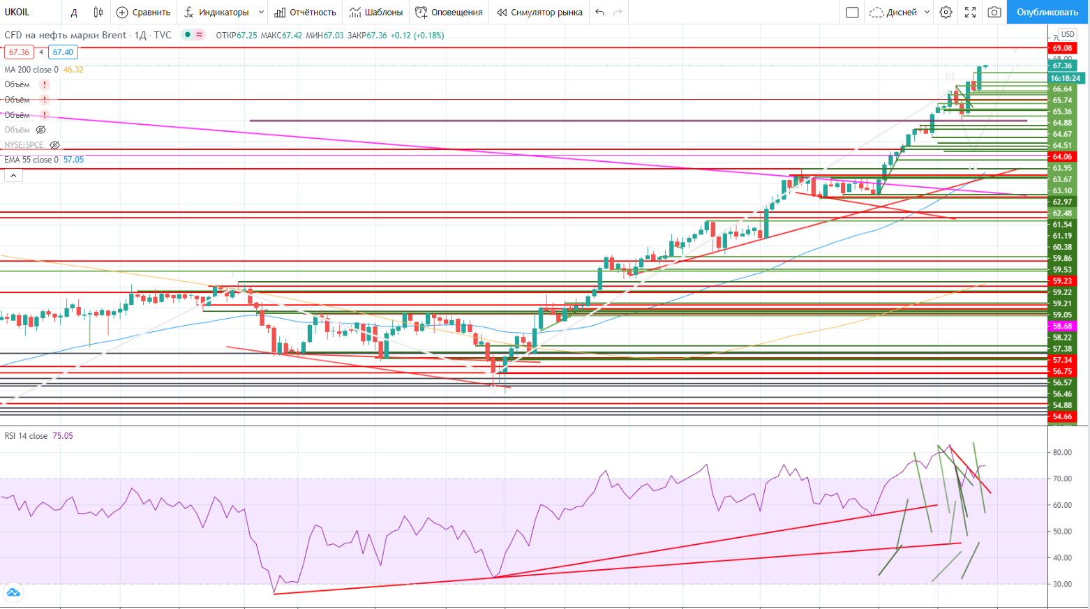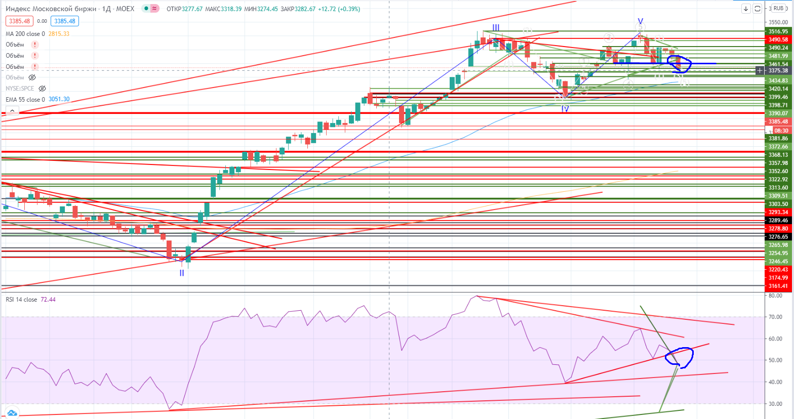 Индекс ММВБ закрылся на «основной» сессии ниже уровня 3400, RSI под трендом. Это очень странно, с учетом роста в нефти, предпочтительней был ШОРТ!!! Такое впечатление, что кто-то «сильный» использует высокую цену на нефть для разгрузки.