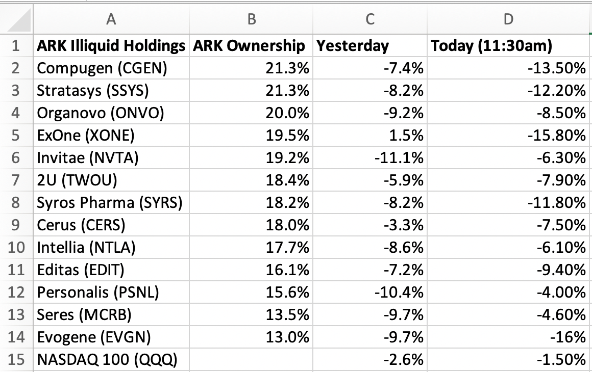 СЕО фонда Cathie Wood прокомментировала WSJ, что у них есть значительный «щит» в виде долей в ликвидных активах (Tesla), которые они будут продавать, чтобы докупить неликвиды в случае обвала. Если фонд и правда так будет делать, то на обвале рынка он будет становиться еще более неликвидным, и в случае оттока инвесторов из ETF-ов ARK Investment будут еще более резкие падения в акциях, которые держит фонд.