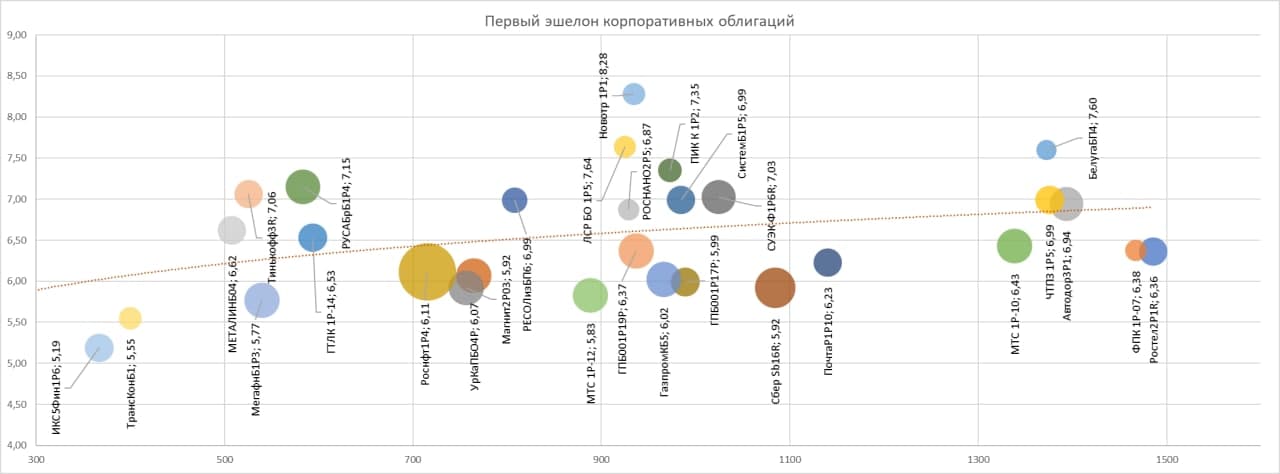 Не покидает ощущение, что корпоративные бумаги недодают доходности. Максимум, на что можно рассчитывать в первом эшелоне – 7-8% годовых. Т.е. премия к инфляции около 1,5-2%. Но это максимум. Усредненная доходность превышает нынешний уровень инфляции всего примерно на 1%. Добавим сюда инерционность сползания котировок корпоративных бумаг (эффект запаздывания в сравнении с ОФЗ) и задумаемся, точно ли пришло время для покупок?