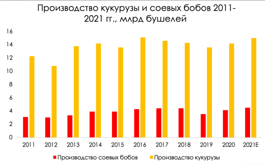 По оценке Министерства сельского хозяйства в США, в 2021 году компании-фермеры в США могут собрать рекордный урожай кукурузы и соевых бобов из-за сильного ожидаемого спроса на продукцию и пятилетних максимумов цен на их реализацию.
