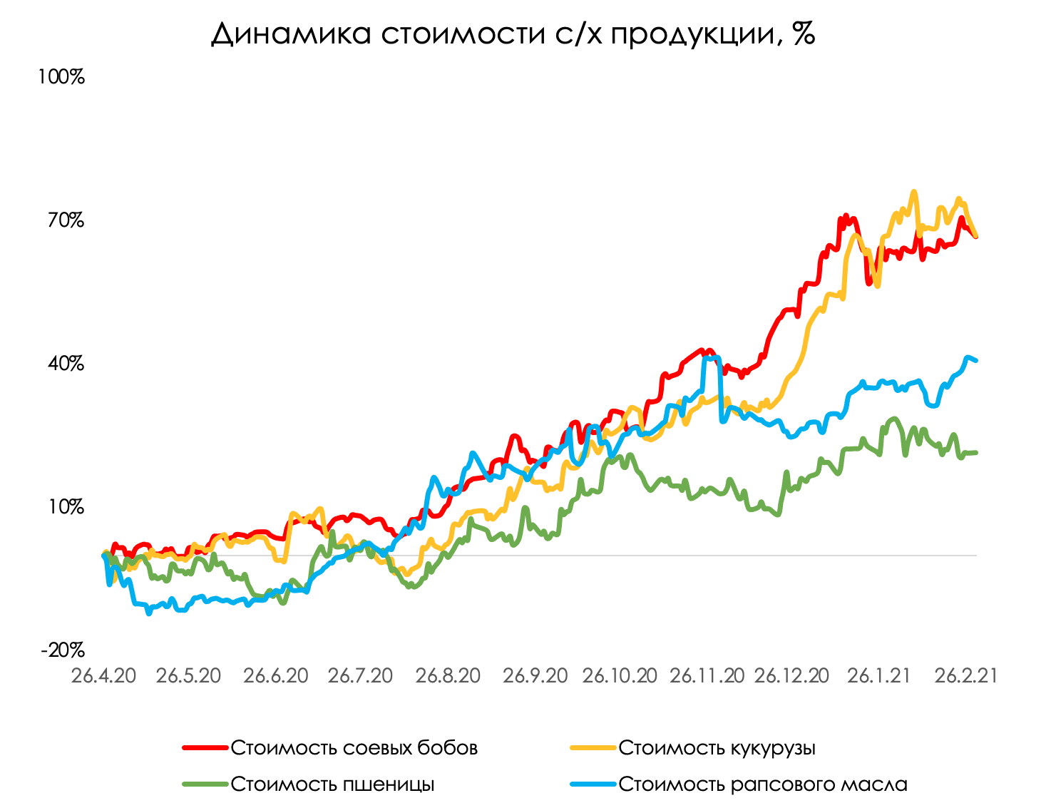 Начало суперцикла в сырьевой промышленности из-за восстановления экономической активности в развитых и развивающихся странах драйвит стоимость не только основного сырья (нефть, уголь, медь и т.д.), но и стоимость сельскохозяйственной продукции. За период с апреля 2020 года по март 2021 года стоимость соевых бобов и кукурузы выросла более чем на 60%, достигнув пятилетнего максимума. Стоимость рапсового масла, как основного компонента для производства биотоплива, выросла на 30%.