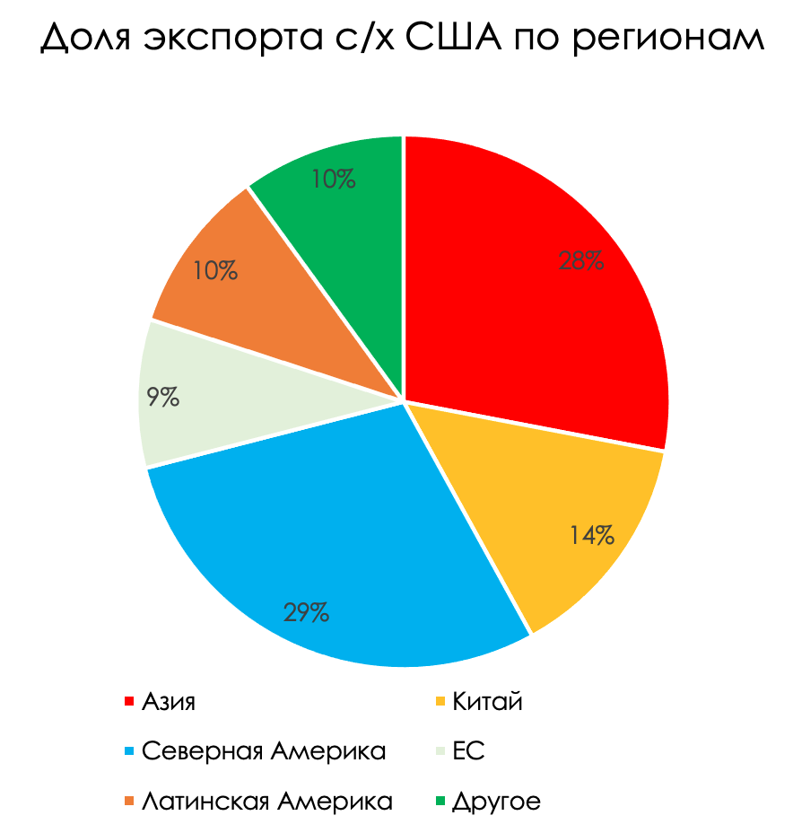Производство сельскохозяйственных продуктов в США растет темпами, которые превышают темпы прироста внутреннего потребления. Поэтому многие сельскохозяйственные производители ориентируется на экспорт конечного продукта. Основным регионом сбыта сельскохозяйственной продукции является Азиатский регион, на который приходится около 42% совокупного экспорта. Китай остается приоритетным рынком, который занимает около 14% от экспорта США.