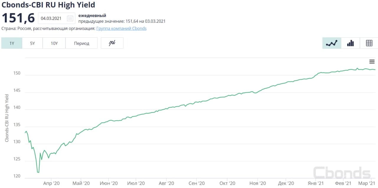 Высокодоходный облигационный сегмент дольше остальных противостоял коррекции рынка облигаций. Но не устоял и он. Само снижение котировок высокодоходных бумаг поступательно, но длится больше месяца. И все же с начала года ВДО показывают положительную доходность (купоны + курсовая динамика), индекс Cbonds-CBI RU High Yield с 30 декабря прибавил 1,1%, или 6,2% годовых. Тогда как и ОФЗ, и субфедеральные облигации, и широкий корпоративный рынок с начала года в убытке. Выросшая инфляция давит на котировки ВДО, однако их внутренняя доходность препятствует глубокому погружению. Не думаю, что сегмент столкнется с «раздачей» по образцу прошлых февраля-марта. Зато многие эмитенты задумаются о повышении купонных ставок для предстоящих выпусков. Чтобы обеспечить привлечение необходимых им денег.