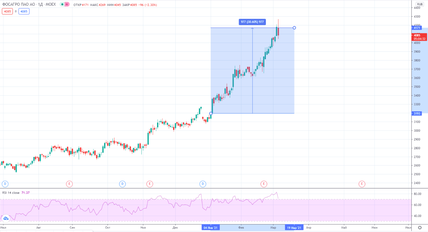 Акции ФосАгро с начала года прибавили более 30% в стоимости после преодоления отметки в 3300 рублей. Даже на боковике нашего рынка с начала года котировки компании с каждым днем обновляют все новые и новые вершины.